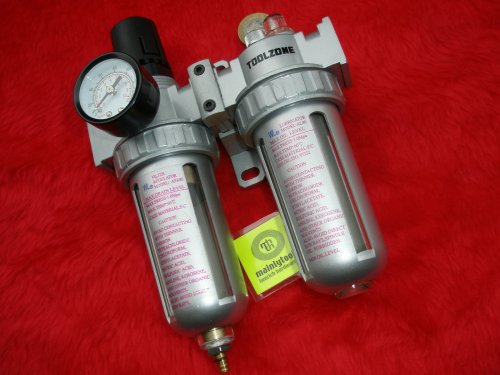 Super value combination 3-in-1 air filter, regulator and lubrication unit Used to control the air quality for all types of pneumatic tools and equipment in professional and DIY surroundings Filter removes solid particles and condensate moisture found in air compressed air Proper use extends the life of air tools and equipment Air flow can be accurately controlled using the step-less regulator valve The micro mist lubricator mechanism supplies lubricating oil in a proportion to air consumption