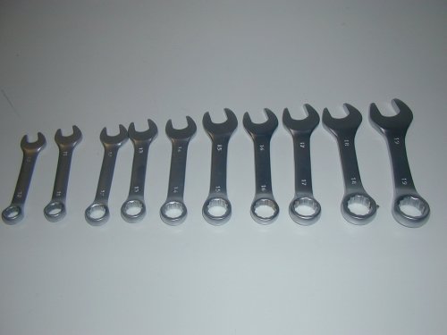 Set of 10 stubby spanners - ideal for getting at awkward nuts . Nice quality set of drop forged heat treated steel stubby combination spanners. Fully polished with satin finish. Each spanner with a open end and a ring end. Spanner sizes: 10, 11, 12, 13, 14, 15, 16, 17, 18, 19mm.
