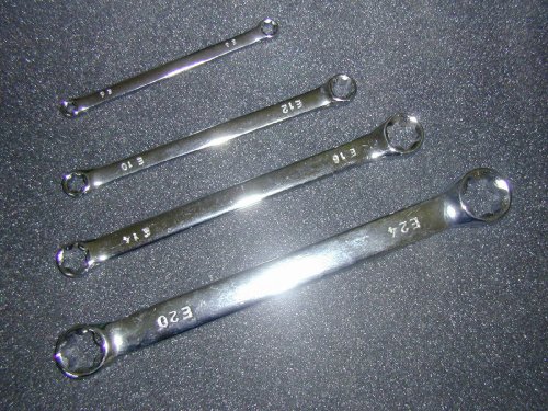 Set of four female star torx ring spanners Chrome Vanadium Hardened steel Fully polished finish Double ended spanners with a different size on each end Sizes: E6 x E8, E10 x E12, E14 x E18, E20 x E24