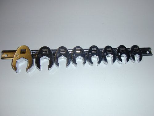 Set of eight crow's feet spanner wrenches Flare nut design 3/8" square socket drive Set includes eight metric sized spanners All contained on a handy rail for storage when not in use Sizes included: 10mm, 11mm, 13mm, 14mm, 15mm, 17mm, 19mm and 22mm